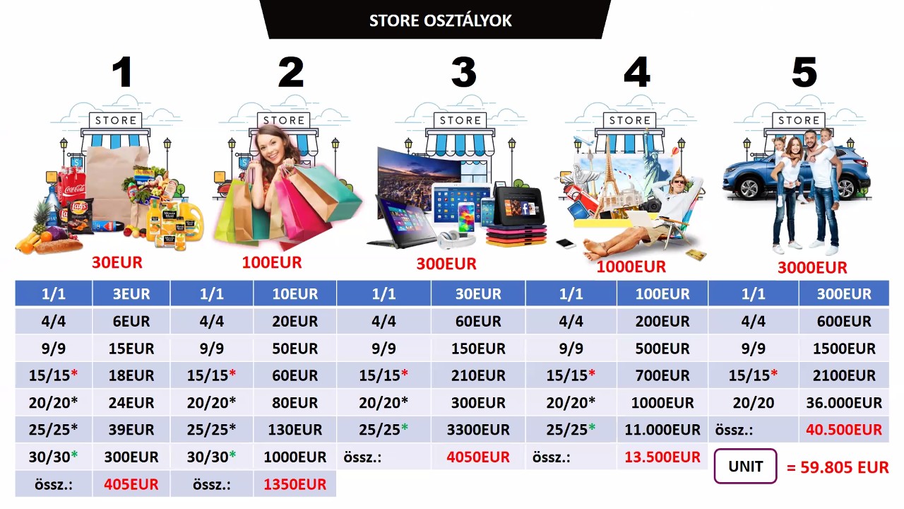 A következő linken azt a táblázatot érheted el, ami a mások vásárlásai után kifizetett jutalékokat mutatja be, mely kétféle módon generálódhat: